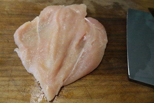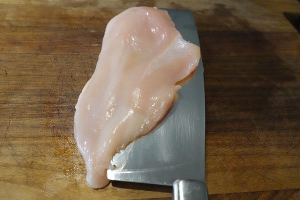 Eine Frischhaltefolie draufgelegt und dann mit einem Plattiereisen (oder einem Holzhammer) vorsichtig flachklopfen.