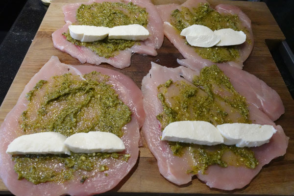 Hier kann man - je nachdem, ob man's eher üppiger will oder nicht - mit Pesto und Mozzarella als Fülle arbeiten, oder man nimmt nur italienische Kräuter und Bierkäse als Innenleben. Das macht dann schon ein paar Kalorien aus (und auch WW-Punkterln, wenn man gerade auf die Linie schauen will 😉)