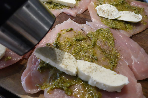 Den Mozzarella in Stifte schneiden und auf die Fleischstücke legen. Noch ein bisserl extra italienische Kräuter und Pfeffer drauf und vorsichtig einrollen.