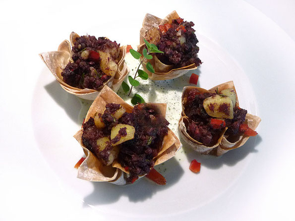 Blunzngröstl hab ich ja schon öfter mal gekocht. Was mir an diesem Rezept so gut gefällt ist der Kontrast der eher weichen Fülle und des knusprigen Wan-Tan-Teigs. Ein besonderes Eßerlebnis!