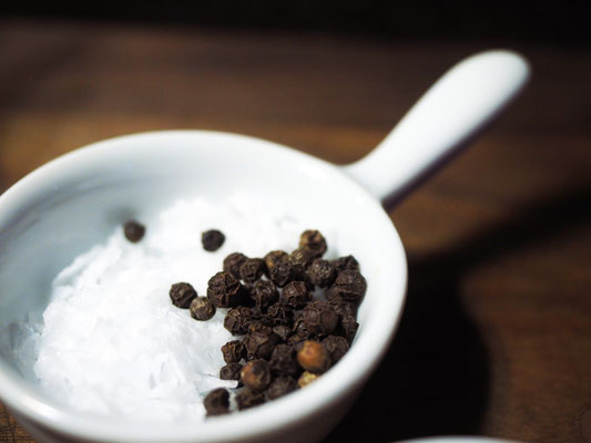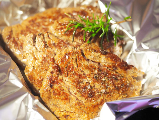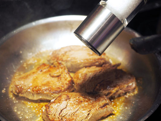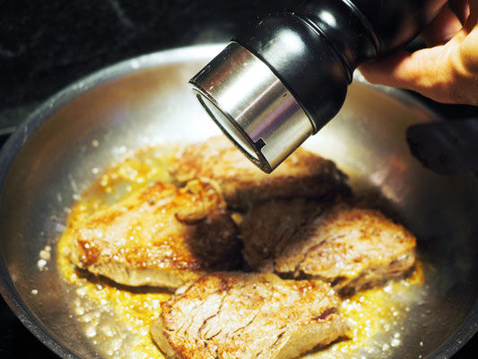 Erst nach dem beidseitigen Anbraten wird gesalzen und gepfeffert - und mit einem Zweig Rosmarin eingepackt.