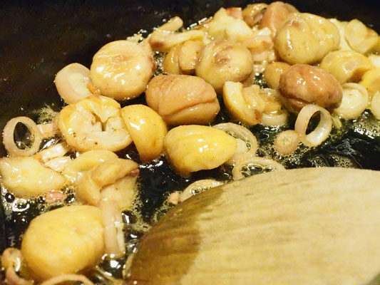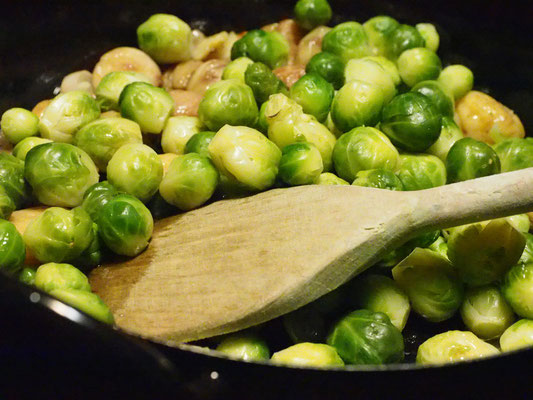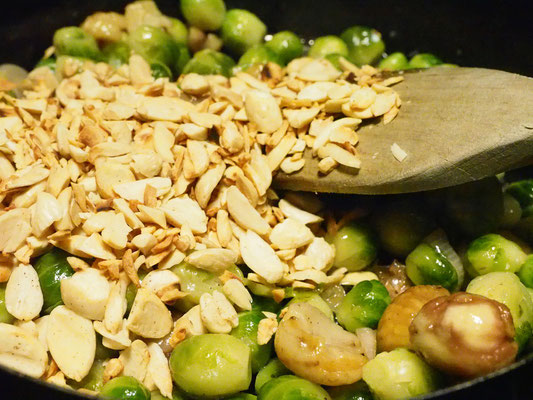 Dann die Maroni dazugeben. Zum Schluss die bissfest gekochten Kohlsprossen untermischen und auf kleiner Flamme ein wenig andünsten. Ganz am Schluss die gerösteten Mandeln untermischen und alles