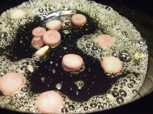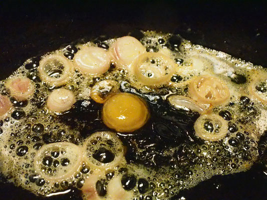 Ein bisschen Olivenöl in einer Pfanne erhitzen und in Scheiben geschnittene Schalotten anschwitzen. Einen guten Schuss Honig dazugeben und karamelisieren lassen. (Ja, ich geb's zu: Ich habe