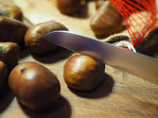 Die Maroni gut einschneiden und dann im Backrohr (wenn möglich mit zusätzlichem Dampf, man kann auch eine Schüssel Wasser auf den Backrohrboden stellen...) 20 Minuten bei 160 Grad