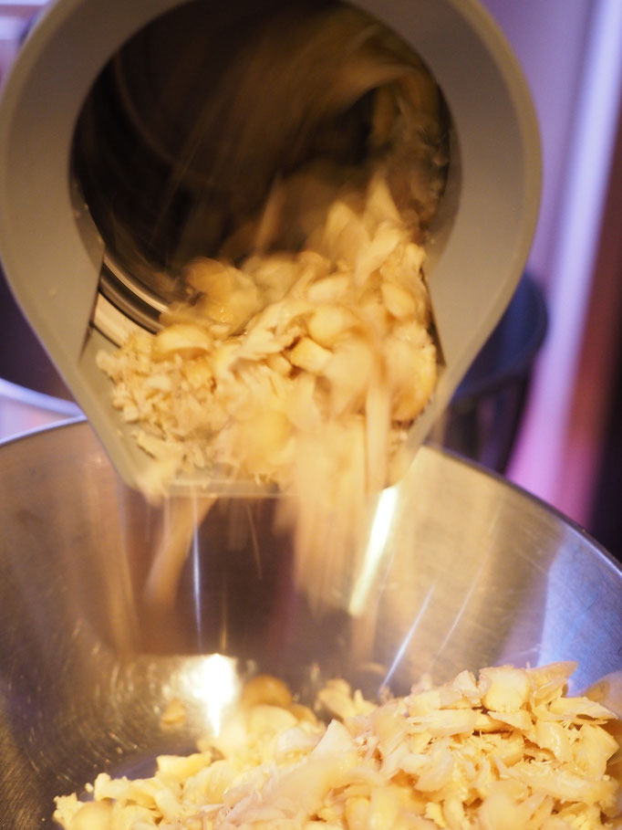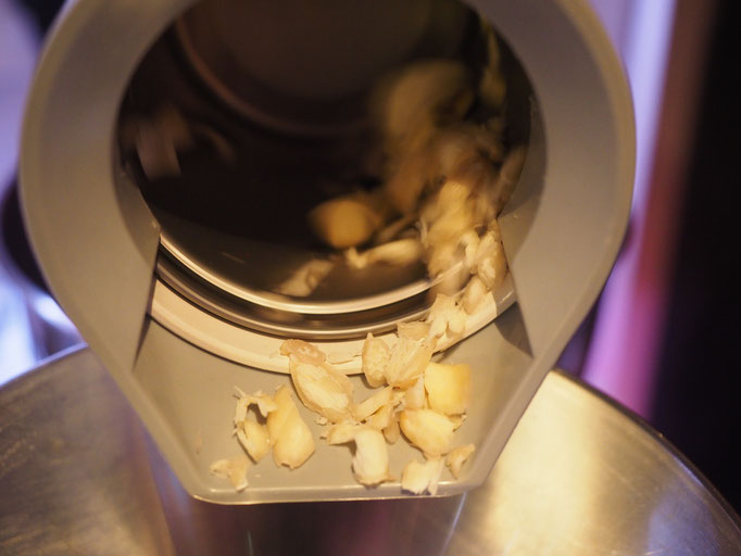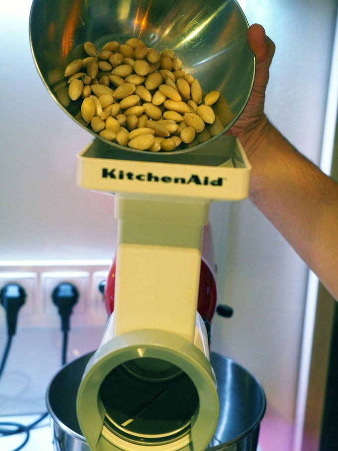 Wir haben das mit der Kitchen-Aid gemacht - mit dem gröbsten Raspeleisen. Danach in einer beschichteten Pfanne ohne Öl anrösten, bis die Mandelsplitter leicht Farbe angenommen haben.