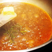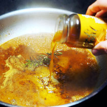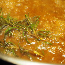 Den Bratenrückstand löscht man dann mit einem Rinderfond ab und lässt ihn langsam einreduzieren.