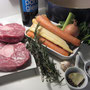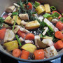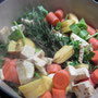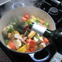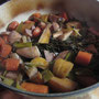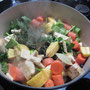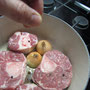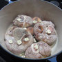 Zuerst die Fleischscheiben salzen und pfeffern und in einem großen Bräter von beiden Seiten scharf anbraten. Dann das geputzte und grob geschnittene Gemüse dazugeben und vermischen. Einen Bund