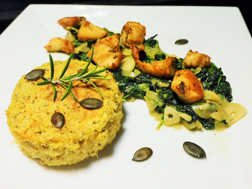 Dann die Küchlein aus dem Ofen holen und mit einem scharfen Messer dem Rand entlang einschneiden. Auf den Teller stürzen und dazu den Spinat mit dem knusprigen Hendl anrichten. Sofort
