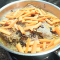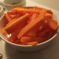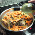 Zuerst die Karotten waschen, schälen und in längliche Stücke schneiden.
