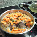 In einer Pfanne mit etwas Olivenöl die Zwiebelscheiben anrösten, bis sie schön braun sind. Dann aus der Pfanne heben und nun - wieder mit etwas Öl - die Rindschnitzel auf beiden Seiten scharf anbraten. Zwiebel wieder dazu und mit Wasser aufgießen. Nun die Karotten und gut zwei Esslöffel Kapern dazugeben. Etwas einreduzieren lassen und dann mit Weißwein aufgießen.