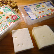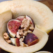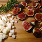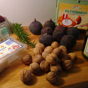 Nüsse schälen und Ziegenkäse in Würfel schneiden. Feigen vierteln.