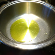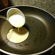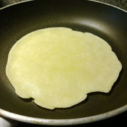 Eine beschichtete Pfanne mit ganz wenig Olivenöl auspinseln und erhitzen. Dann den Teig eingießen und durch Schwenken der Pfanne schön verteilen, bis er recht dünn ist. Auf beiden Seiten circa 2