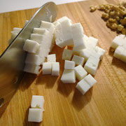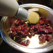 Die Roten Rüben schälen und würfelig schneiden. Man kann hier natürlich auch die vorgegarte, vakuumverpackte Variante nehmen, das macht viel weniger Mühe. In jedem Fall sind aber Handschuhe keine schlechte Idee, denn der rote Farbstoff ist ziemlich intensiv und hartnäckig!
