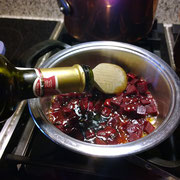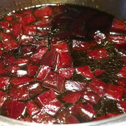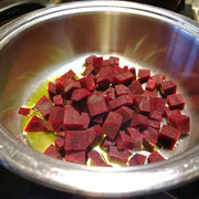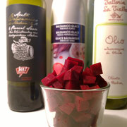 Eine Pfanne mit etwas Olivenöl erhitzen und die Würfel hineingeben. Für ein, zwei Minuten anrösten und dann Balsamico Glaze und Balsamicoessig dazugeben. Nun für gut 30 Minuten köcheln lassen. Wenn die Flüssigkeit verdampft ist, kann man mit etwas trockenem Rotwein aufgießen. (Hat man die vorgegarten Rüben verwendet, muss man nur ca. 10 Minuten Kochzeit einrechnen...)