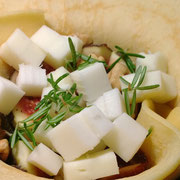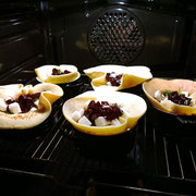 Feigen, Rote-Rüben-Würfel, Nüsse, Ziegenkäsewürfel hineingeben und den Saft der Roten Rüben drüberträufeln. Ein paar Rosmarinnadeln drüberstreuen und in den Ofen schieben.