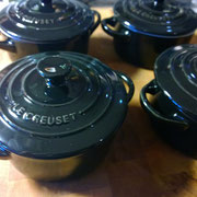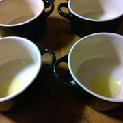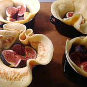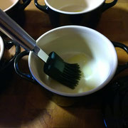 Nun kleine feuerfeste Schüsseln vorbereiten und mit ganz wenig Olivenöl auspinseln, damit die Crépes nicht anbrennen können. Die Crépes hineinlegen und eventuell unter Zurhilfenahme eines Glases vorsichtig hineindrücken.