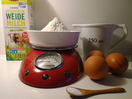 Für die Crépes 250ml Milch und drei Eier mit 200g Mehl und einer Prise Salz vermischen, bis eine nicht zu dünne aber auch noch gut flüssige Mischung entstanden ist. Eventuell noch Milch oder Mehl hinzufügen, bis die gewünschte Dicke erreicht ist.