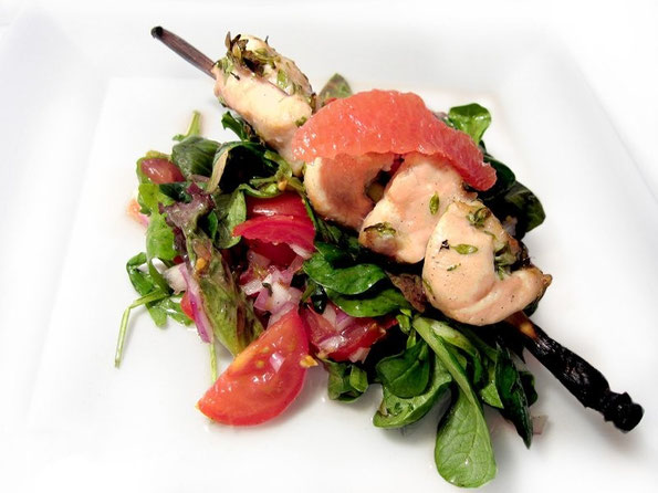 Nun auf die Teller anrichten und die fertig gegrillten Spieße darauflegen. Mit einem Grapefruitfilet garnieren und servieren...