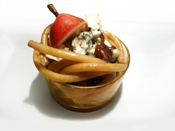 aufrollt. Danach mit den Birnenstilen dekorieren und servieren.