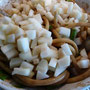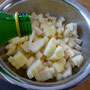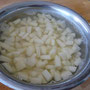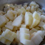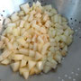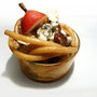 Den Stil schräg abschneiden und in Zitronenwasser legen. Er dient als Deko. Die Birnen dann schälen und das Kerngehäuse entfernen. Dann in ca. 1cm große Würfel schneiden. In eine Schüssel geben